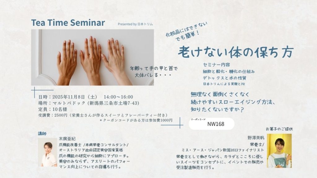 <新潟県内のリアルセミナーのご案内> 化粧品にはできない、でも簡単!「老けない体の保ち方」Tea Timeセミナー 11月8日 14:00~16:00 お顔はお化粧やプチ整形などで「見た目の若さ」を保つことは … 続きを読む 老けないからだの保ち方 ティータイムセミナー atマルトパドック! 栄養士さんが作るスーツ付き